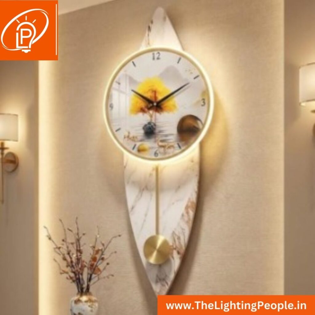 modern metal pendulum wall clock Product Name Golden Metal Profile Watch No.of Wall Light One pc Material Metal Light Type LED 3IN1 Dimensions 13.8″ x 11.8” / 35cm x 30cm Body colour Golden MRP 5017/- Rs Discounted Price 4014/- Rs (1 pc)